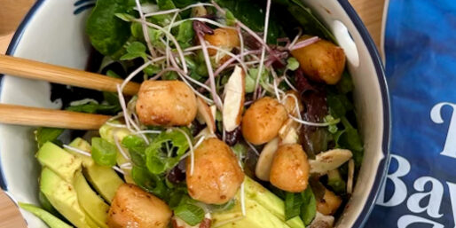 - Add your rice, mixed greens and chopped fruit and vegetables to your serving bowl. Top with your seared scallops, scallions, and sliced almonds. Drizzle with vinaigrette and top with a few dashes of hot sauce to kick it up a notch.