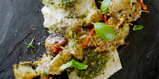 PARMESAN AND PESTO COD WITH ROASTED POTATOES